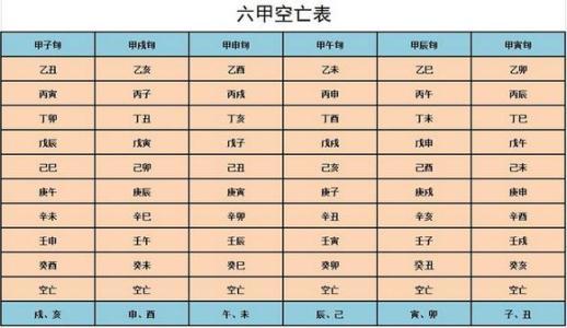 甲子年寻戌亥空,甲戌寻申酉空,甲申旬午未空;甲午旬辰巳空;甲辰旬寅卯空,甲寅旬子丑空。 在八字预测中,以日柱为标准查空亡。但凡日柱所属的一旬中轮空的十二地支,就称之为该八字命局的空亡,如庚子是在甲午旬中,甲午旬中辰巳轮空,那麼。在以庚子为日柱的八字命局中,辰巳就为空亡。