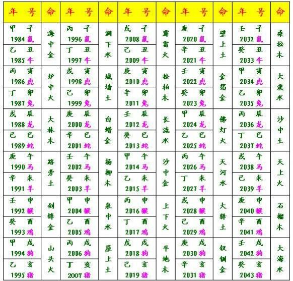 六十甲子纳音,流传为春秋时期阶段的孙膑明确提出,把甲子年梳理为相匹配的意境,是汉朝东方朔进行。年命是我国古乐中的一个专业术语。我国的古乐有十二乐律,他们分别是黄钟、太簇、姑洗、蕤宾、夷则、无射、大吕、丧钟、仲吕、林钟、南吕、应钟。每个乐律中,又各自有宫、商、角、徽、羽五个声调。共六十音。之后,古代中国的命相学家运用古乐中的六十音,与六十甲子相互配合在一起,依照金、火、木、水、土的次序转动为宫。这就是年命的基本原理。年命是古代人探寻响声与人事部门的一种认知能力试着,如同外星生物交给地球上人们的礼品。六十甲子纳音拥有 很深的喻义,干为天,支为地,音为人正直。年命是对身综合性叙述的归纳。璧如“甲子乙丑海里金”,大家有一句话叫“泥牛入海”描述一直沒有信息,金比石块的比例更重,在海洋中掩藏更加深入。“甲午乙未沙中金”,明的,看到了沙,沙中金光四射,但金并不是很多。性情而言,一个厚重,一个夸张,功效而言描述珍贵、好看。纳音五行有它的推算规律性。推算技巧:甲己子午——九,乙庚丑未——八,丙辛寅申——七,丁壬卯酉——六,戊癸辰戌——五,巳亥——四。大衍之数为49。水——1,火——2,木——3,金——4,土——5。大衍之数减和剩下数为几,再用五行生得年五行(金生水,水生木,木生火,火生土,土生金)。例如:甲子乙丑,9 9 8 8=34, 49-34=5, 5是土,土生金。因此 ,甲子乙丑为金特性。此方式为两个两个推算。六十甲子纳音,也称六十花甲年命,说白了“花”,是说沒有规律性,实际上很有规律性。