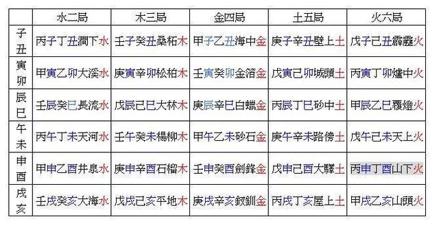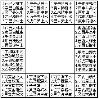 以上地支五行,全是前后左右犯冲;如第一排子午相冲、丑未相冲。全部天干地支组成全是阳配阳,阴配阴。把以上最终的字連起來,就組变成納音速記口訣:子午銀燈架壁鉤,戌辰煙滿寺鐘樓,申寅沙土地燒柴濕,就是納音六甲頭。子午——戌辰——申寅,三组。下边再详细介绍一种用传统式歌诀记忆力纳音五行:甲乙滨江烟,丙丁没谷田,戊己荧堤柳,庚辛挂杖钱,壬癸林钟满,甲子纳音全。之上歌诀中每段的后三个字均各意味着一种五行,如锦取其金字边,意味着年命属金,江有三点水,意味着年命属水,烟有火字旁,意味着年命属火。那麼甲乙、丙丁、戊己、庚辛、壬癸,如何表述呢?甲乙能够构成六组:甲子乙丑(锦—金)、甲寅乙卯(江—水)、甲辰乙巳(烟—火)——甲午乙未(锦—金)、甲申乙酉(江—水)、甲戌乙亥(烟—火)。五行每三组一循环系统。丙子丁丑(没—水)、丙寅丁卯(谷—火)、丙辰丁巳(田—土)——丙午丁未(没—水)、丙申丁酉(谷—火)、丙戌丁亥(田—土)。戊子己丑(荧—火)、戊寅己卯(堤—土)、戊辰己巳(柳—木)——戊午己未(荧—火)、戊申己酉(堤—土)、戊戌己亥(柳—木)。庚子辛丑(挂—土)、庚寅辛卯(杖—木)、庚辰辛巳(钱—金)——庚午辛未(挂—土)、庚申辛酉(杖—木)、庚戌辛亥(钱—金)。壬子癸丑(林—木)、壬寅癸卯(钟—金)、壬辰癸巳(满—水)——壬午癸未(林—木)、壬申癸酉(钟—金)、壬戌癸亥(满—水)。