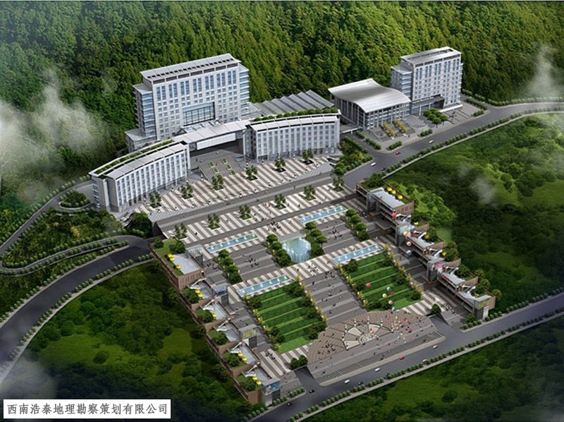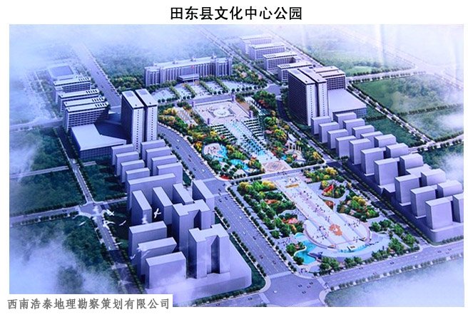 关于选址的问题,从县城整体来看,现在政府的位置居中心广场近,包括中心广场还在右江反弓水背的位置。如果向南移进新城市规划区内,则可避过反弓水的位置,但这也是有困难的,因新城区只是规划,多少年后才可发展起来,现在选一个政府的位置在那里也不切合实际。文化广场的位置也可用于政府的办公地,因此地较居新老城区的中心点,左抱新城区,右揽老城区,但向位的改变不知是否可以调整。因受老路的影响,改后会否出现不伦不类的情况,北边和东西已有民房,建县委,县政府的位置设在此,宽度是否够(长度是没问题的),如果宽度够(大气点),就可考虑把政府(行政)的办公大楼设计在原广场的北边,向南发展的多大都没问题。根据“中心广场”的原设计方案还是不错的,它本身已溶入了风水的格局,特别是行政大楼,取纳气左右环抱之势。前面水法宜屈不宜直,坐北向南会显的更大气点,特别是在中心广场第一期的规划图中,南边两边的建筑物向两边张开,如八字,有纳气的作用。抱合第二期中心广场的全局,建议第一期的和第二期的方案稍加变动就可以了。办公(行政大楼)的前边原设计的水法有“玉带缠腰”的水法是很好的,反过来以后,此水要在北边,北边的地势高过南边,居高临下,此水法就更好利用了,好像北京故宫的金水河(桥)一样,够大气了。
