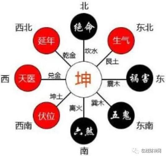如图一所示,按照房屋住宅的坐向,坐西南向东北的住宅是坤宅,图中延年位、生气位等红字方位为吉位,绝命位等黑字方位为凶位。吉凶情况是: