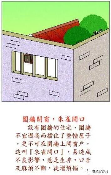 围墙开窗朱雀口,口舌是非经常有。围墙不存在开窗采光的需要,围墙开窗不仅没有必要,也容易失去防护意义,所以住宅的四周围墙要保持完整,否则易惹是生非,造成官非、口舌、病灾等不良事端。